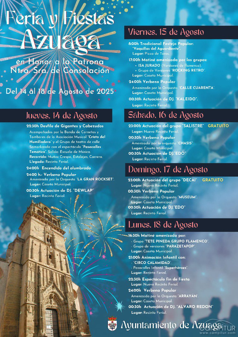 El Ayuntamiento de Azuaga ya ha dado a conocer el esperado programa de la Feria y Fiestas 2025 en honor a Ntra. Sra. de Consolación, que tendrá lugar del 14 al 18 de agosto. Un año más, la localidad se prepara para vivir unos días cargados de cultura, música, alegría y tradición, con propuestas para todas las edades y gustos.