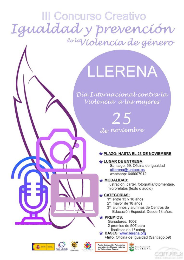 La concejalía de Educación, Infancia y Juventud, Igualdad y Participación Ciudadana del Ayuntamiento de Llerena convoca el III Concurso Creativo Igualdad y Prevención de la Violencia de Género.