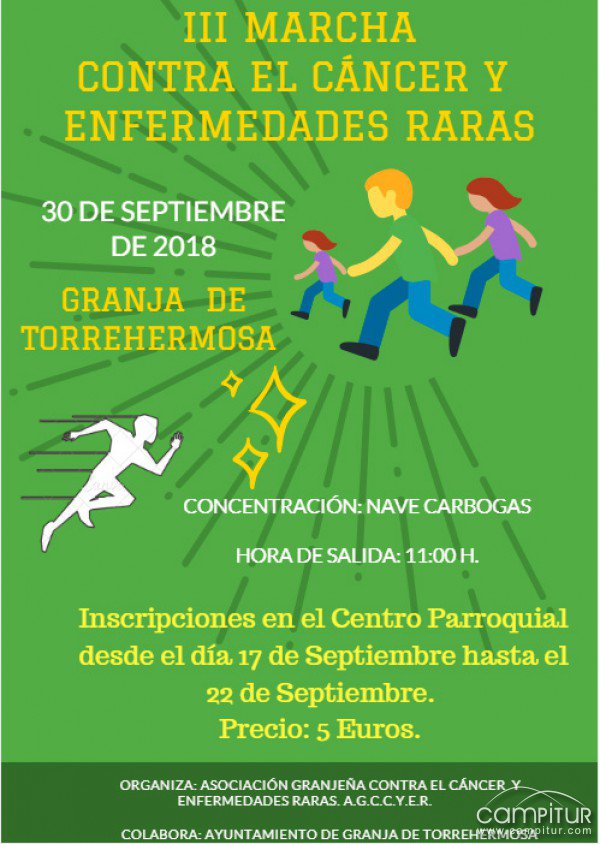 Granja de Torrehermosa acoge la III Marcha Contra el Cáncer y las Enfermedades Raras, organizada un año más por la Asociación Granjeña Contra el Cáncer y con la colaboración del Ayuntamiento de la localidad.